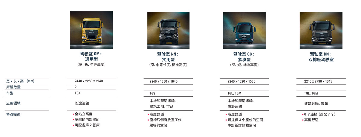 全新一代曼恩卡車駕駛室共有四種不同尺寸供您選擇